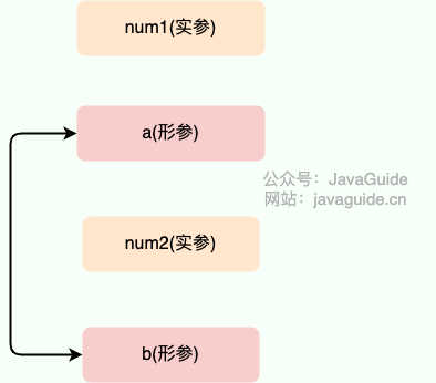 在 swap() 方法中,a、b 的值进行交换,并不会影响到 num1、num2。因为,a、b 的值,只是从 num1、num2 的复制过来的。也就是说,a、b 相当于 num1、num2 的副本,副本的内容无论怎么修改,都不会影响到原件本身。