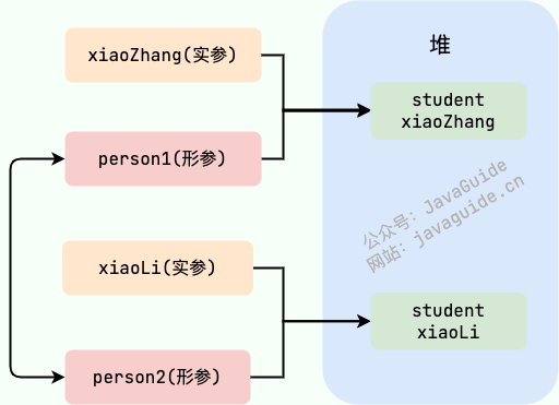 swap 方法的参数 person1 和 person2 只是拷贝的实参 xiaoZhang 和 xiaoLi 的地址。因此, person1 和 person2 的互换只是拷贝的两个地址的互换罢了,并不会影响到实参 xiaoZhang 和 xiaoLi 。
